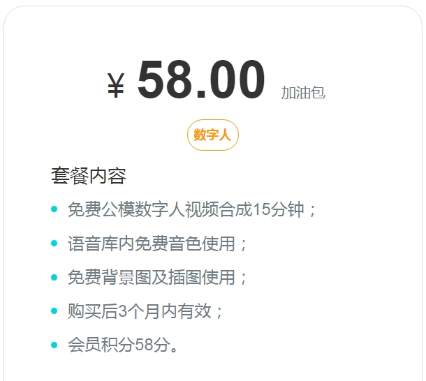 2、数字人加油包58元套餐:58元